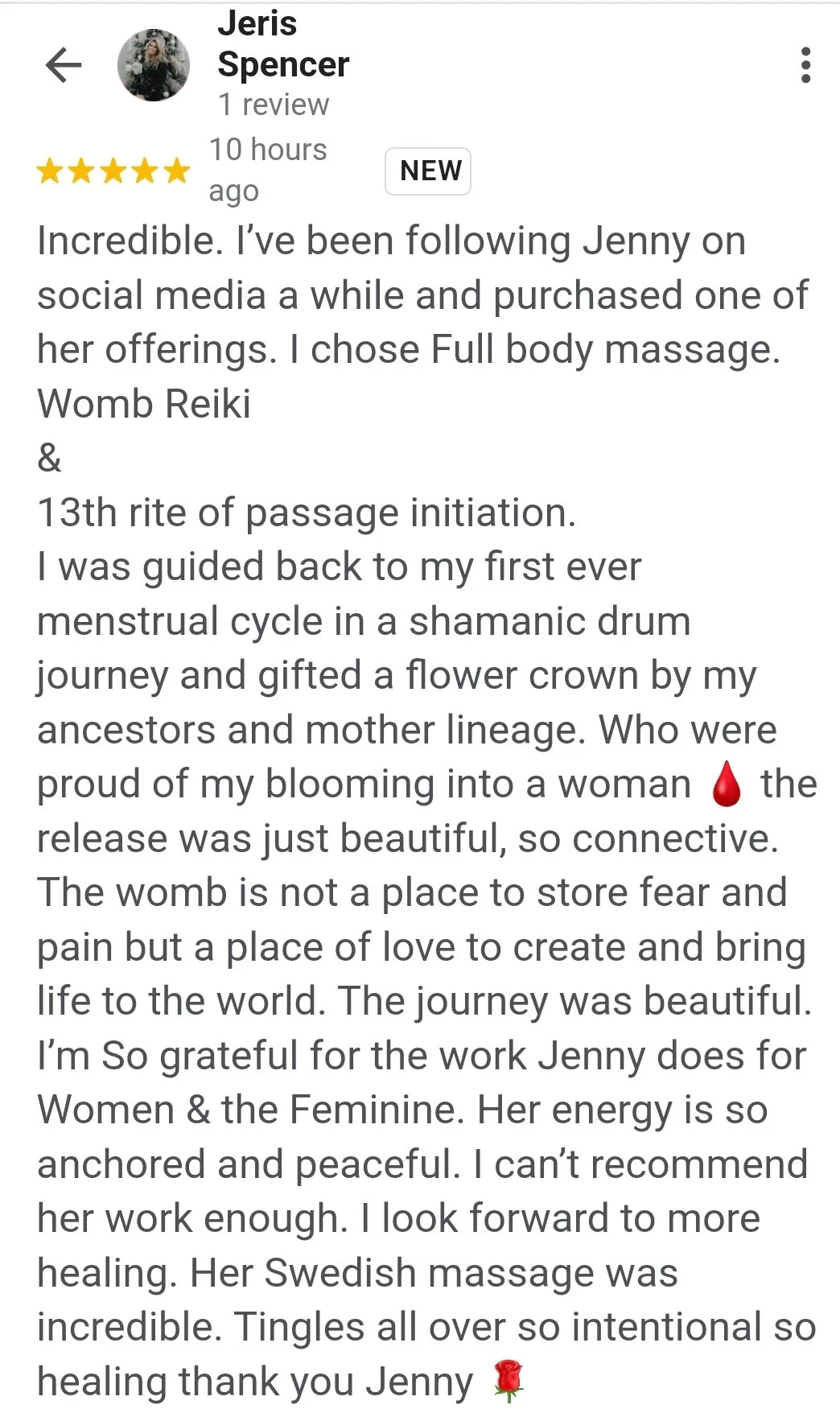 “I spent the day with Jenny a few months ago & what followed after I left was a transformation unlike anything I had ever experienced. Her gently, guiding love showed me how to access my highest self & how to banish anything that didn’t serve me. It was honestly a rebirth. Can’t wait to see her again!”