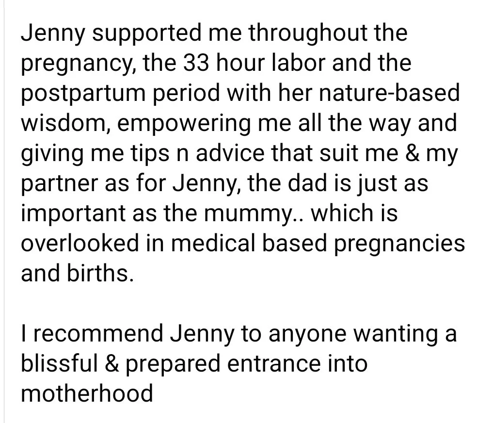 “We have had the absolute pleasure of having Jenny as our Doula for the last 6 months. Jenny is truly a treasure and one of a kind. She was also our celebrant at our handfasting Ceremony. As both Celebrant and Birthkeeper Jenny has the unique ability to both empower and nurture you simultaneously. We always felt safe and were grateful for her boundless wisdom which always upheld our innate Sovereignty & supported our Intuition. Her wisdom is deeply felt from embodied life experience. Jenny thank you for being there for us, and for standing alongside us at the threshold. Always empowering us as parents and our choices. Thank you for nourishing us with your holy mothering, delicious home made bread and dhal. We hope that many more people are supported by Jenny.”
